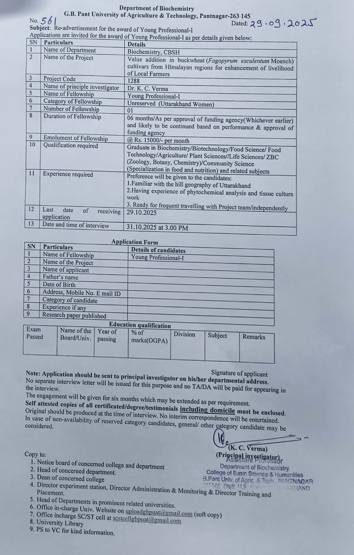 GBPUAT Young Professional I Recruitment 2025: Vacancy Details